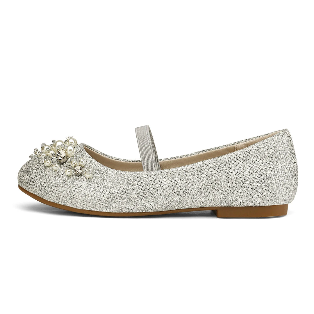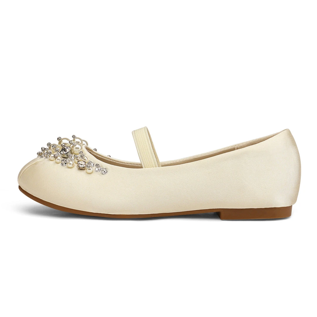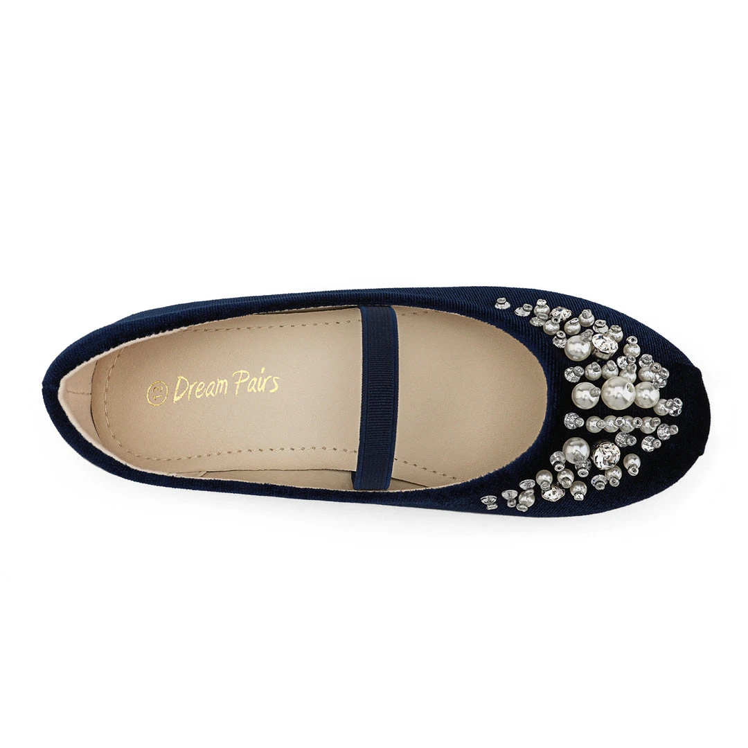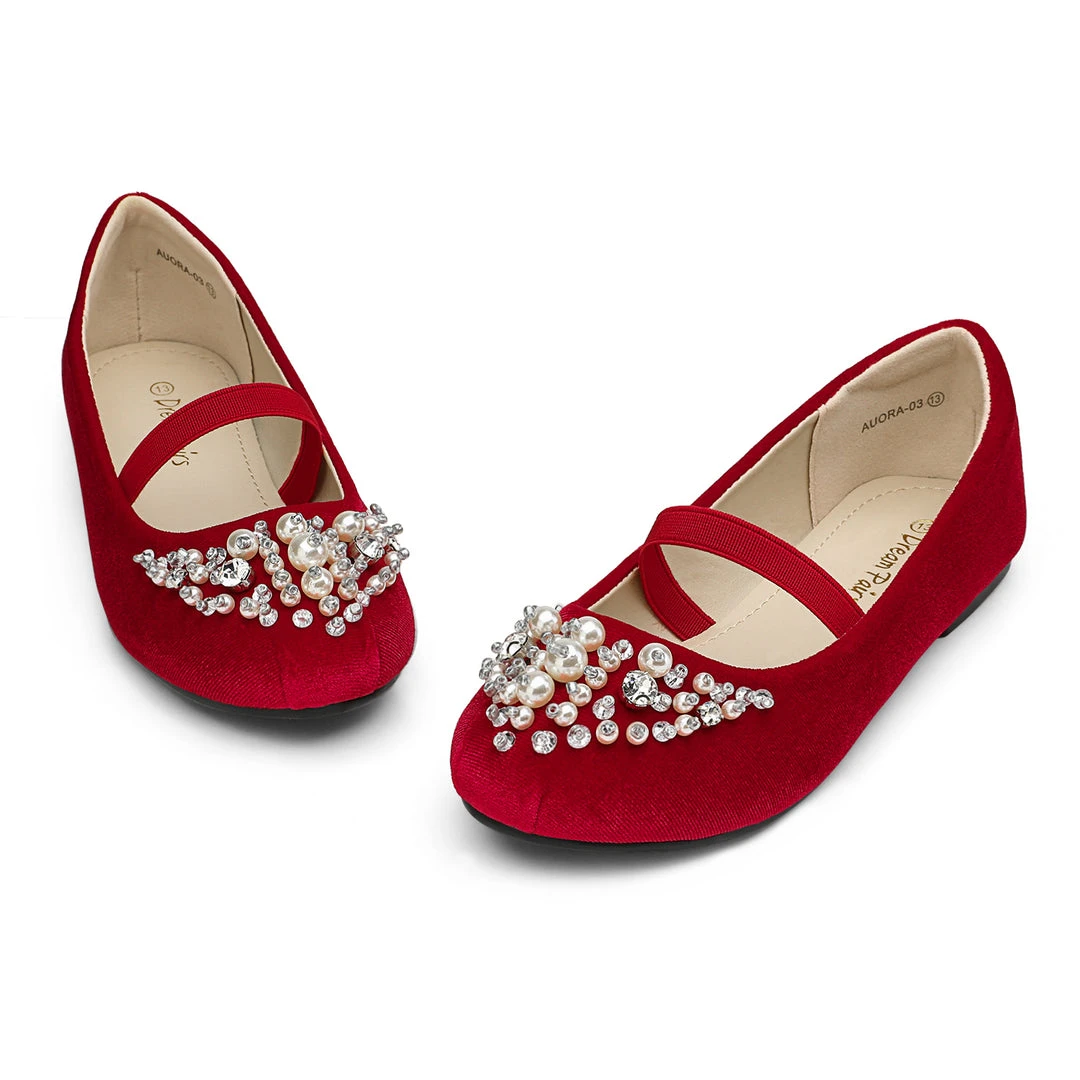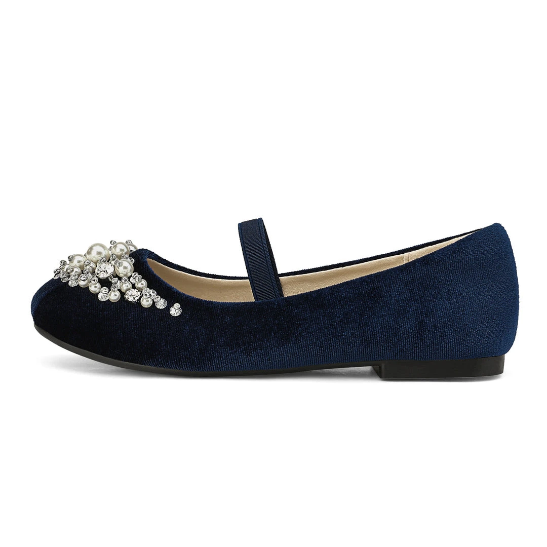 Bedazzled and glorious girls. Mary Jane ballerina flat shoes. We adore this embellishment against an ivory suede. For added excitement grab a pair in pink or blue. We’ve decided to make shoes that can fit into the fashion needs of every little human while making safety a priority with a TPR outsole outfitted for premium grip and control. Feel confident buying our girls mary jane ballerina flats knowing that protection is at the forefront of our minds.