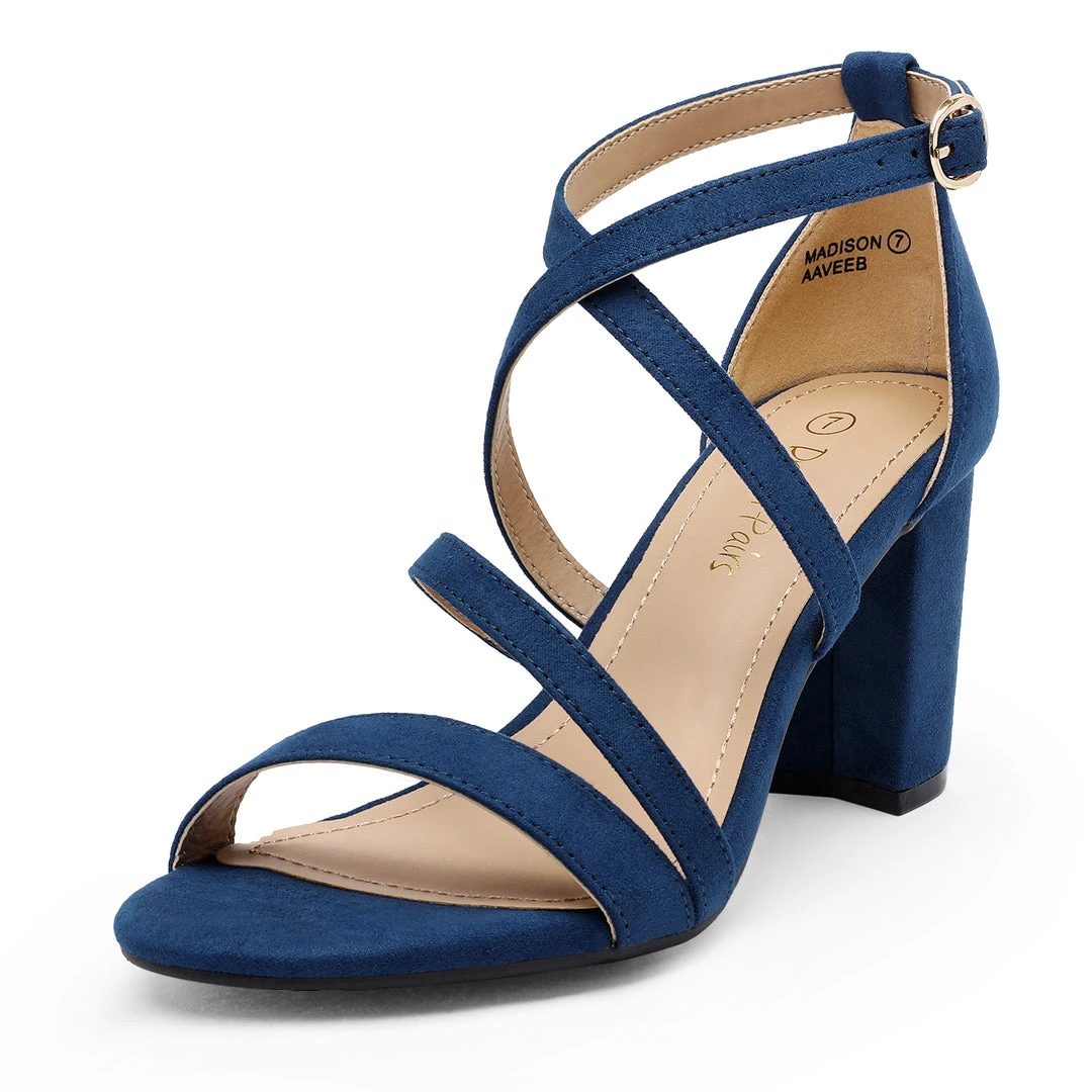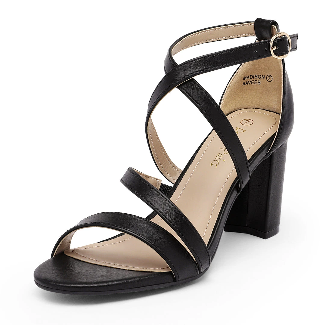 - Crossed strap design with adjustable buckle closure