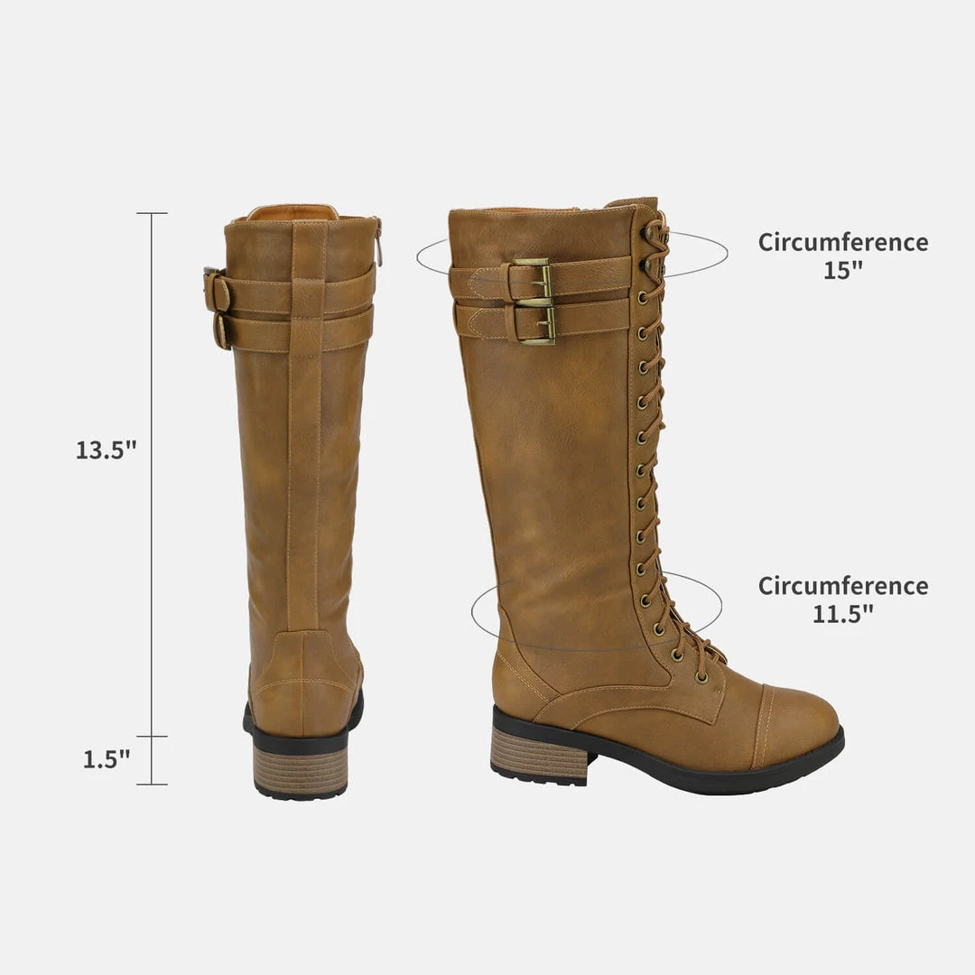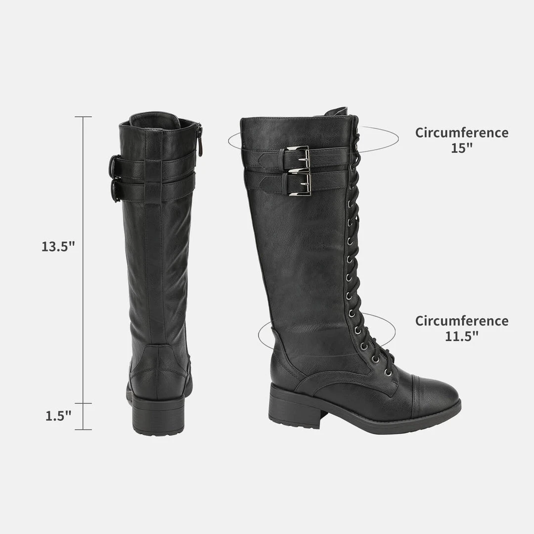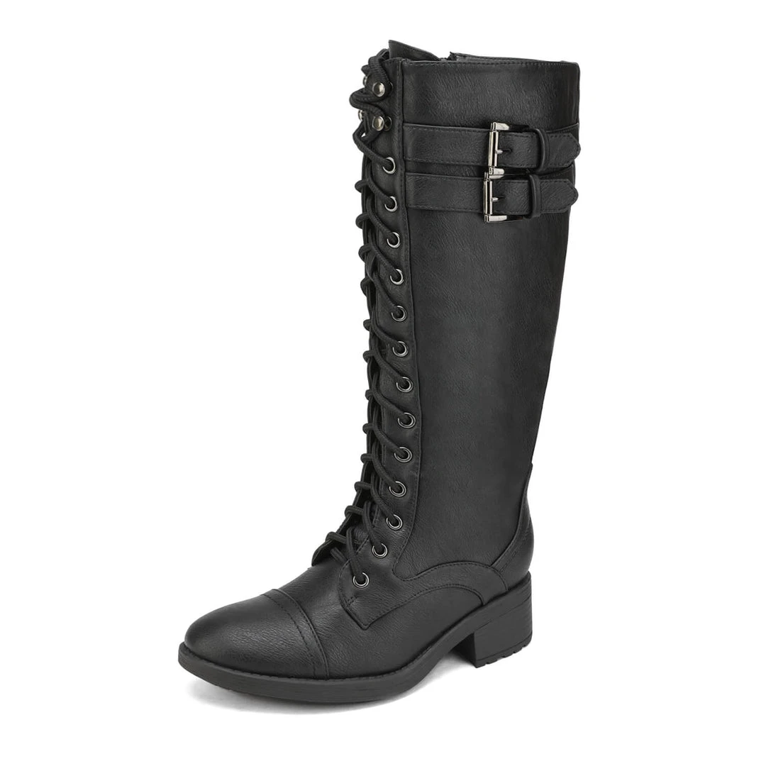 Lace up and style these knee high riding boots with your favorite pair of jeans. Stand tall in a classic riding boot style curated for women who know exactly what they want and need. Adjustable buckles and a side zipper to easily slip on and off. These boots are charming and audacious. Grab a pair for yourself today.