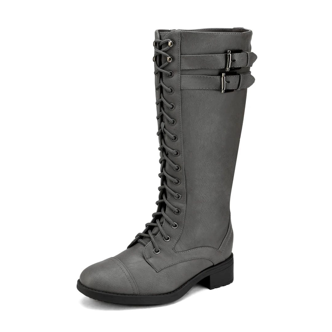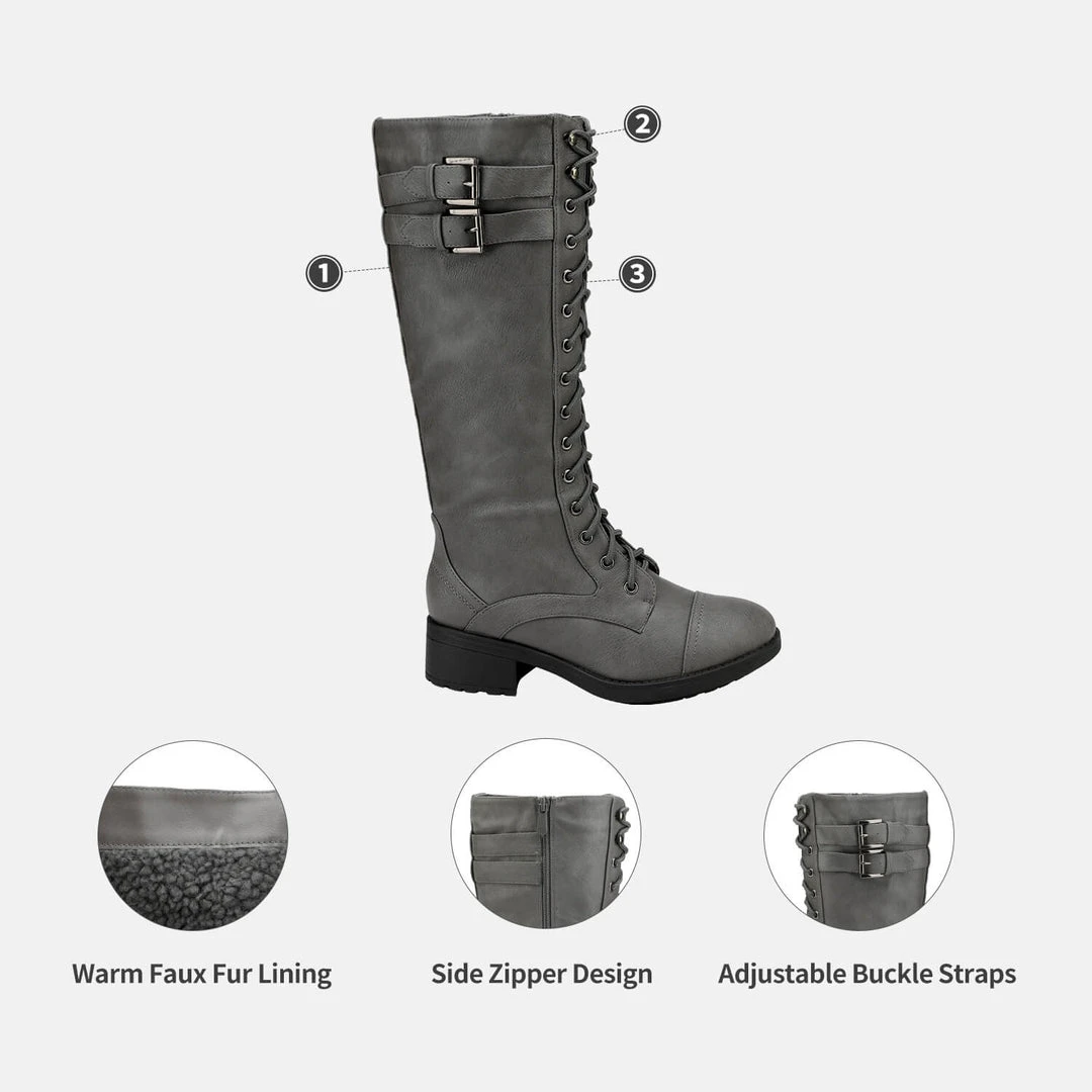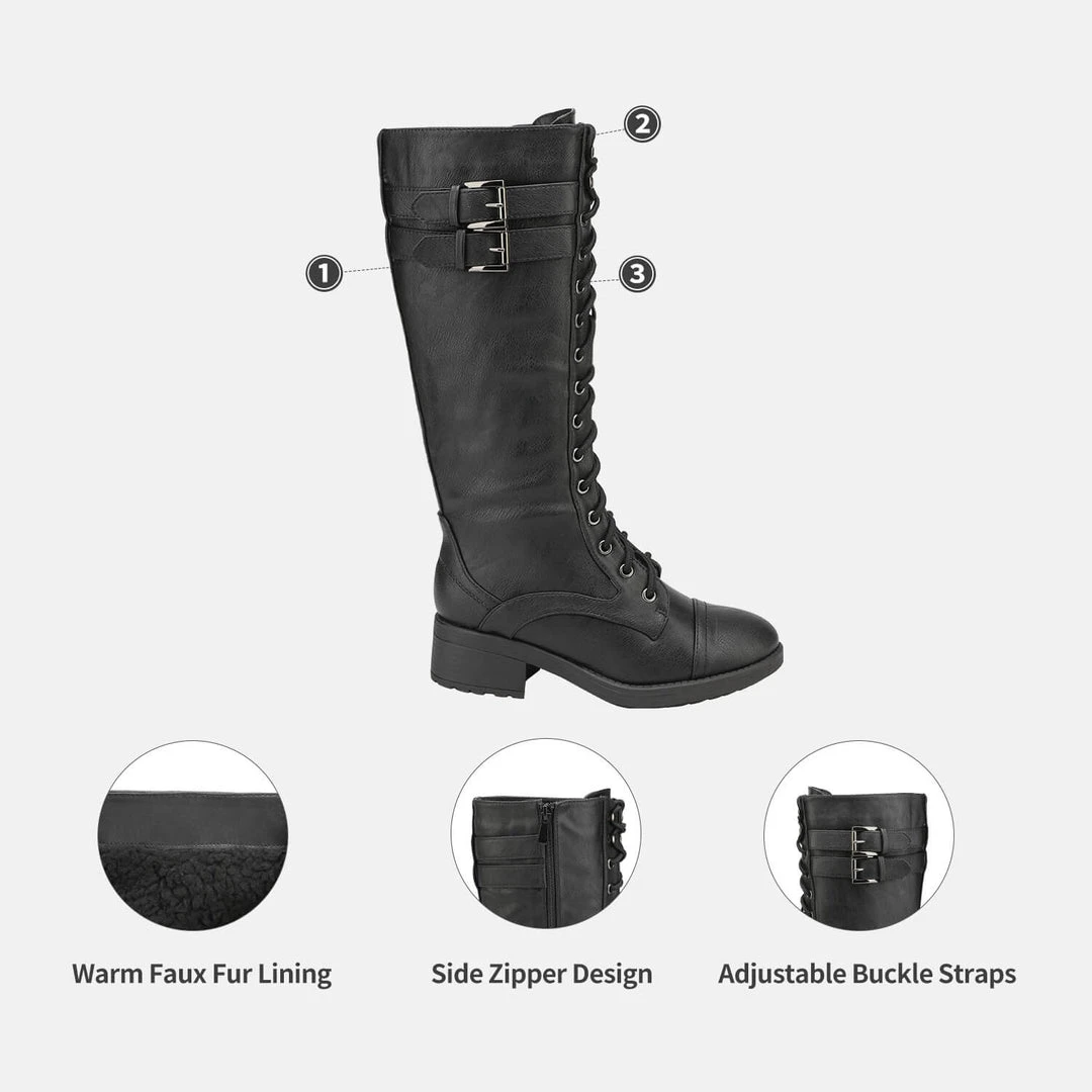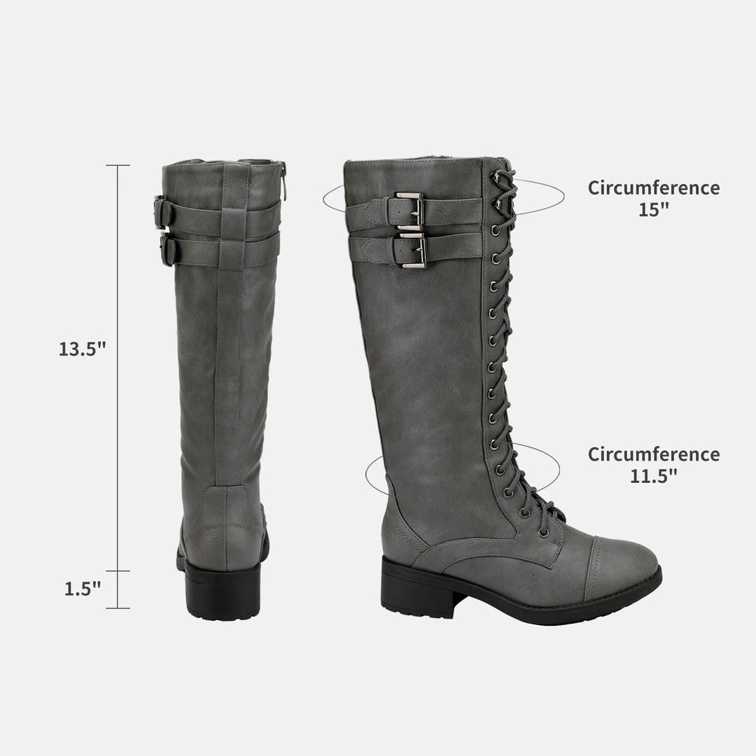 Lace up and style these knee high riding boots with your favorite pair of jeans. Stand tall in a classic riding boot style curated for women who know exactly what they want and need. Adjustable buckles and a side zipper to easily slip on and off. These boots are charming and audacious. Grab a pair for yourself today.