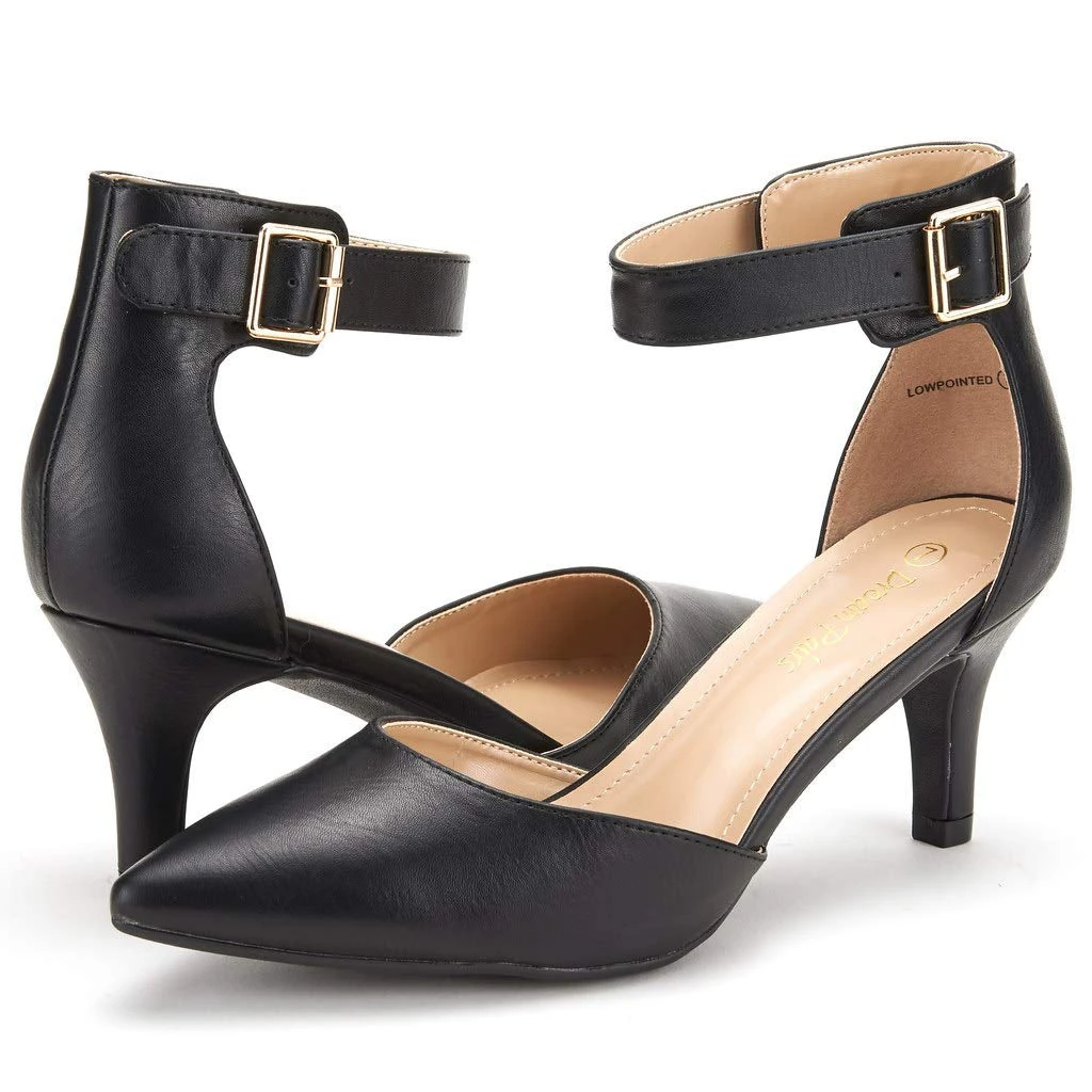 Instantly add sophistication to your outfit with comfortable low heel ankle strap pumps that can take you from office to happy hour. Designed with a pointed toe and elegant buckled ankle strap that can complement dresses and skirts with ease.