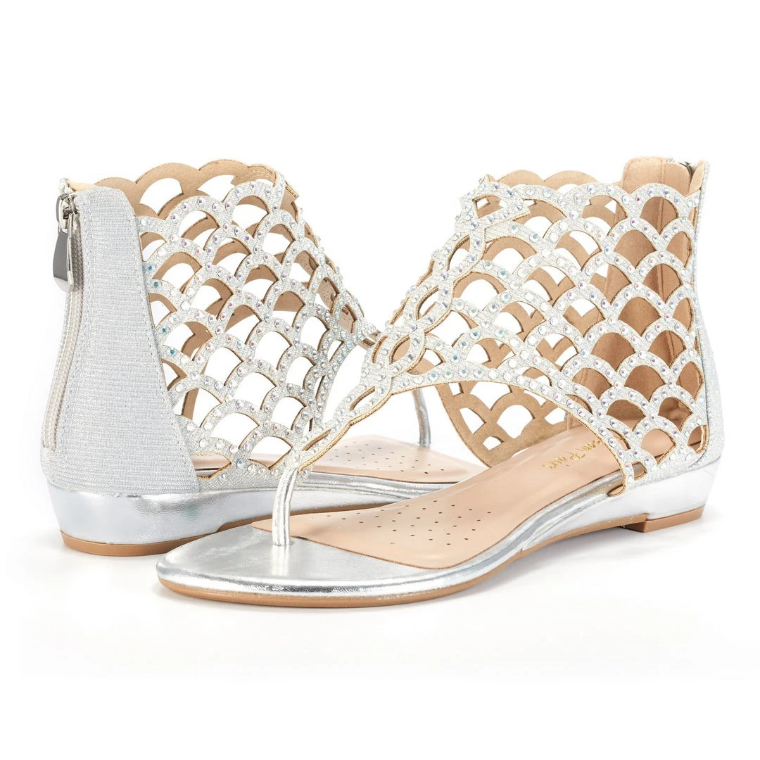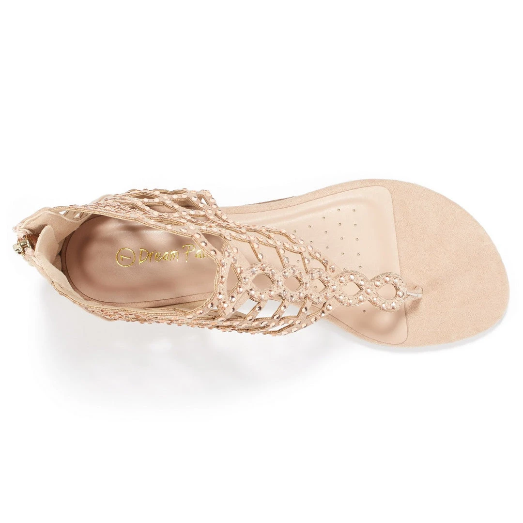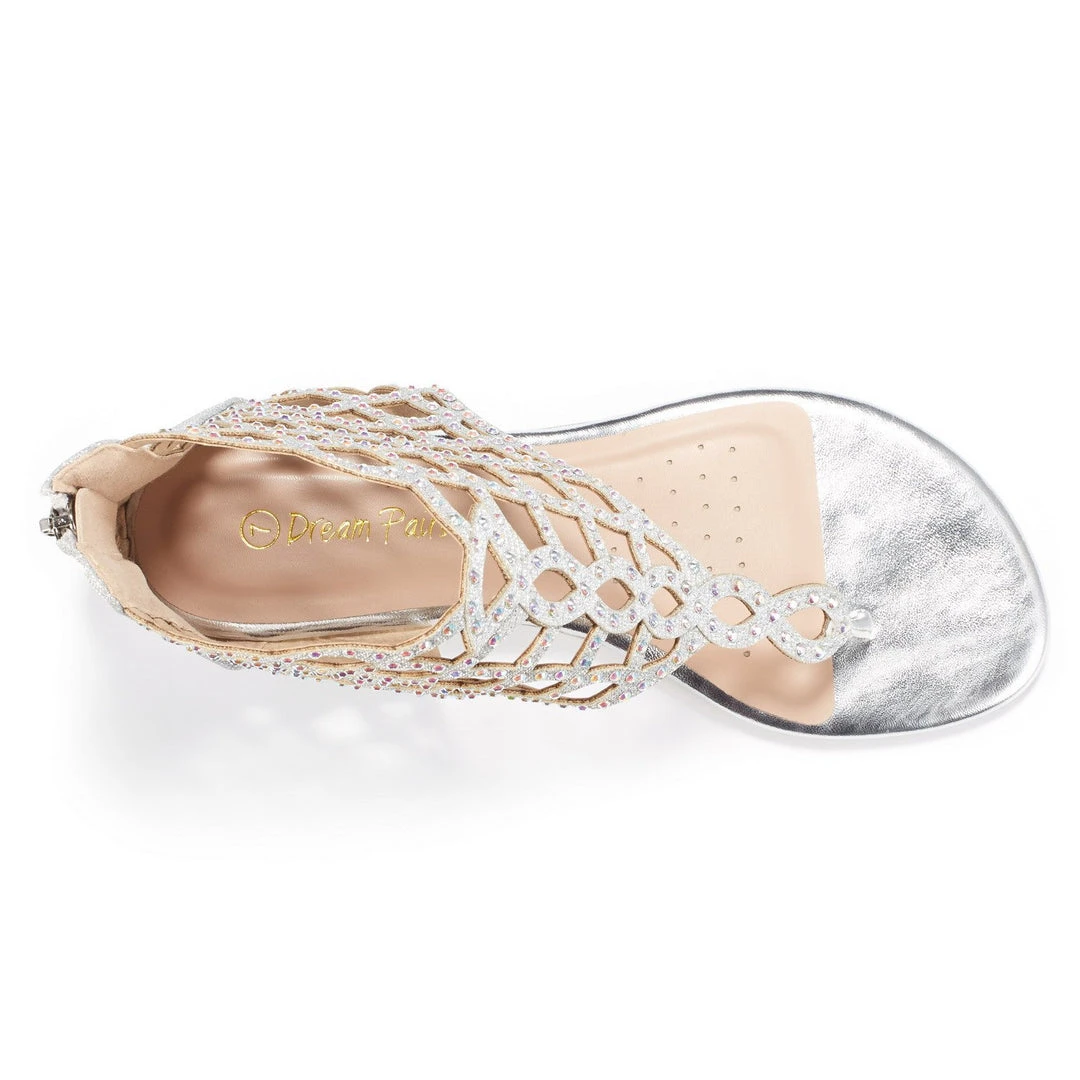 Queenly, princess, royalty rhinestone flat sandals. Breathtakingly stylish with awe-inspiring comfort. Delight in a back zipper closure that easily slips on and off while remaining secure. The insole is padded with faux leather for a delightful feel and the thong-style construction is anti-chafing and anti-hatred. Positive vibes and indescribable comfort.